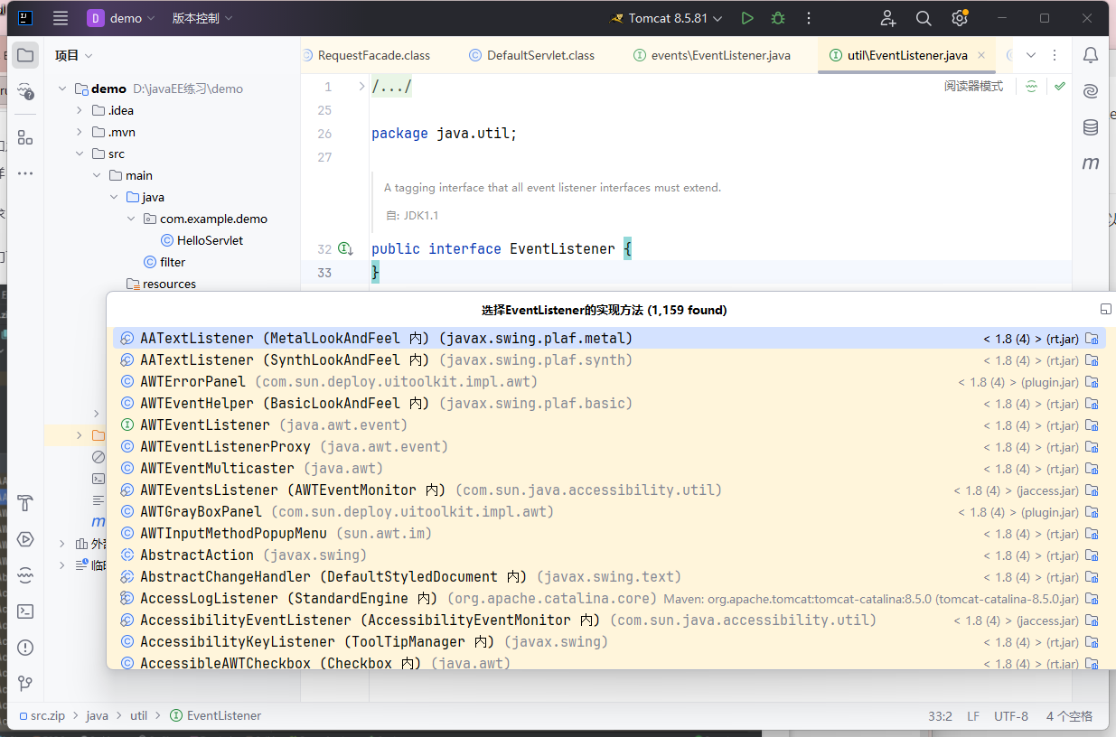 可以看到这个接口有非常多的实现方法,如果需要实现内存马的话就需要找一个每个请求都会触发的 Listener,我们去寻找的时候一定是优先找 Servlet 开头的类