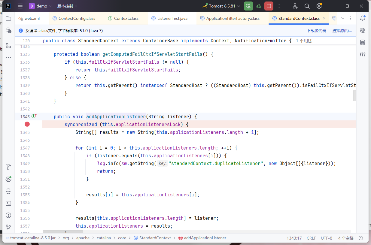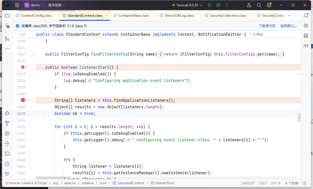 到这一步的调试就没有内容了,所以这里的逻辑有应该是和 Filter 差不多的,Listener 这里有一个 Listener 数组,对应的 Filter 里面也有一个 Filter 数组。