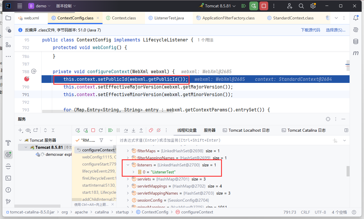 我们重点关注 Listener 的读取,最后找到在这个地方读取了 web.xml