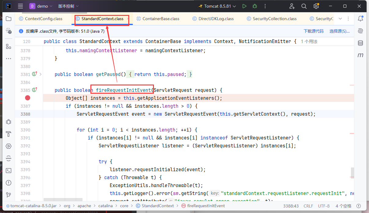 在 Listener 组内的 Listeners 会被逐个触发,最后到我们自己定义的 Listener 的 requestInitialized() 方法去