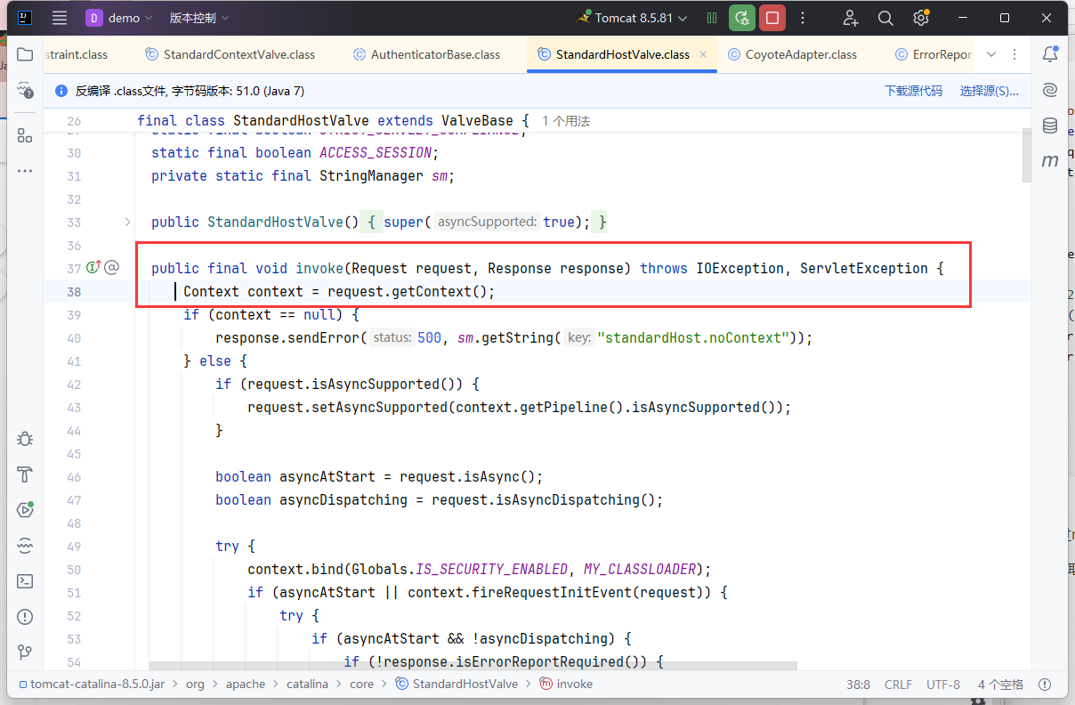 在 StandardHostValve#invoke 中,可以看到其通过request对象来获取 StandardContext 类