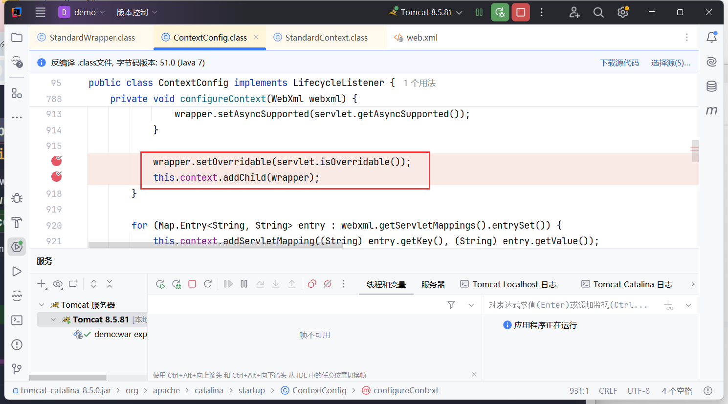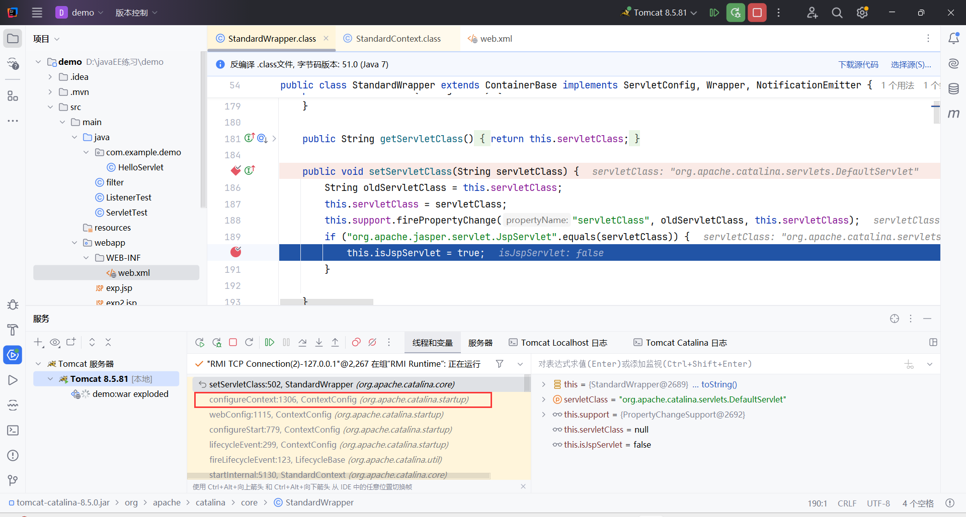 在org.apache.catalina.core.StandardWrapper#setServletClass()处下断点调试,回溯到上一层的ContextConfig.configureConetxt():