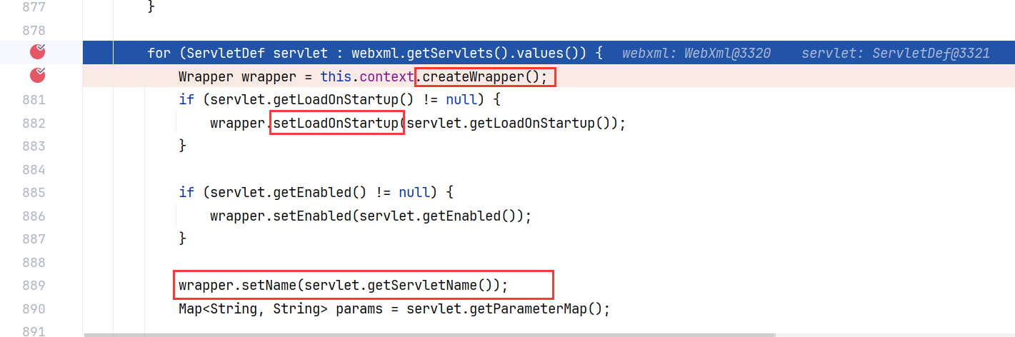 在这里我们可以很清楚地看到Wrapper的初始化流程,首先调用创建了wrapper,然后调用set方法配置wrapper相关的属性,我们可以参考web.xml中需要配置的属性来推测wrapper的关键属性(即图中红框),需要留意的一个特殊属性是load-on-startup属性,它是一个启动优先级,后续再分析: