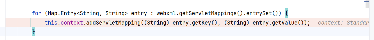 接着会遍历web.xml中servlet-mapping的servlet-name和对应的url-pattern,调用StandardContext.addServletMapping()添加servlet对应的映射: