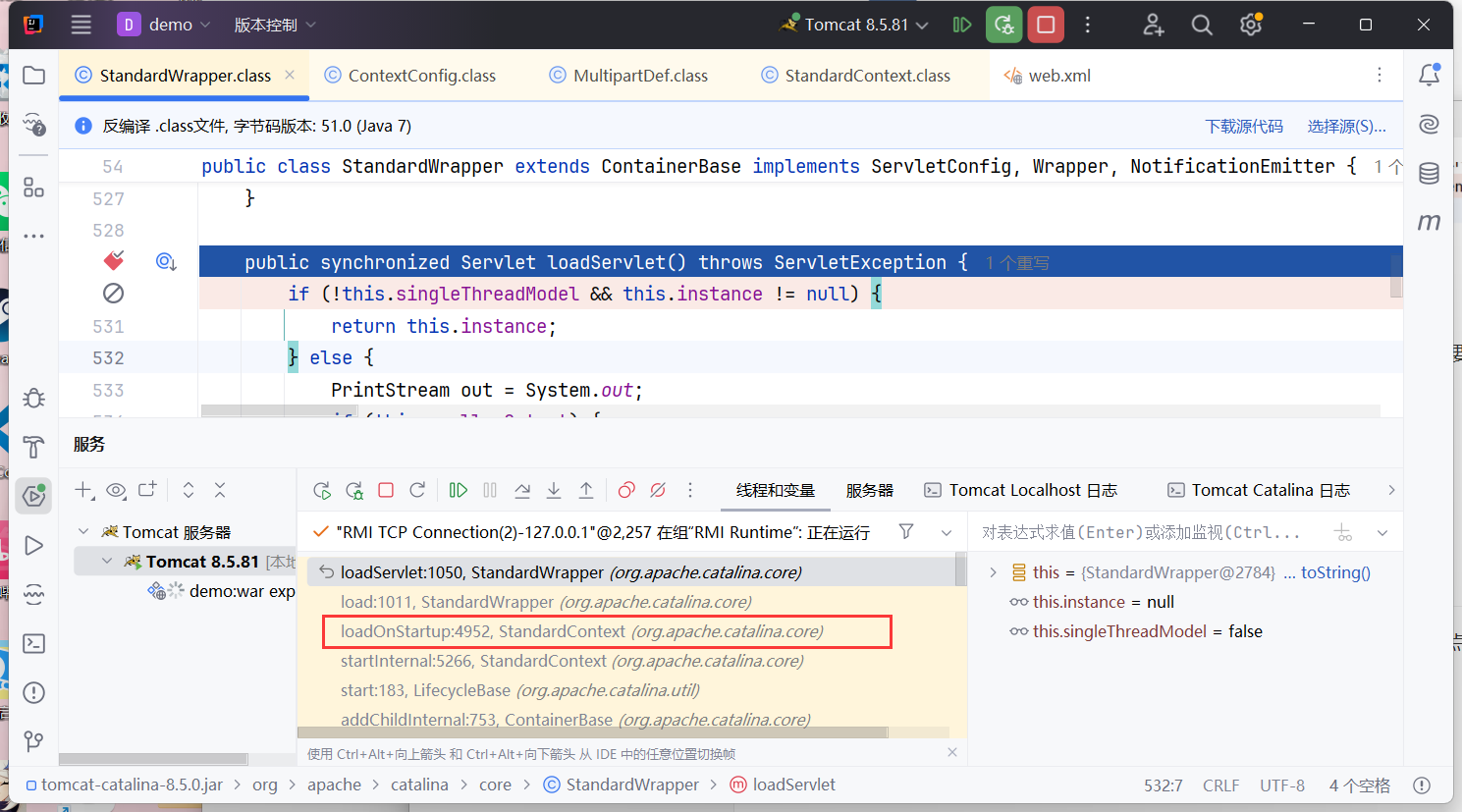 在org.apache.catalina.core.StandardWrapper#loadServlet()处下断点调试,回溯到StandardContext.startInternal()方法: