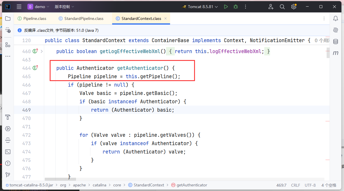 addValve() 方法对应的实现类是 StandardPipeline,但是我们是无法直接获取到 StandardPipeline 的,所以这里去找一找 StandardContext 有没有获取到 StandardPipeline 的手段