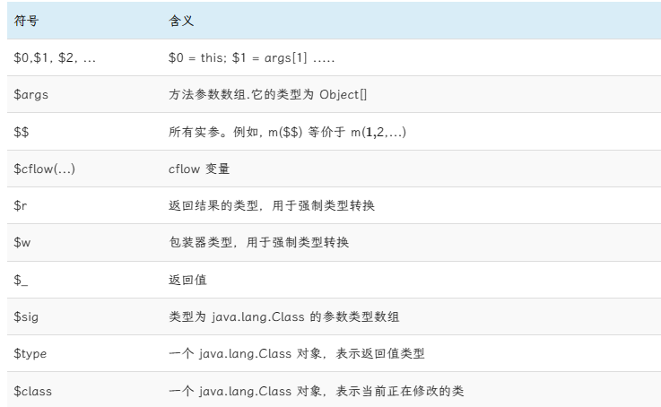 传递给方法 insertBefore() ,insertAfter() 和 insertAt() 的 String 对象是由Javassist 的编译器编译的 。 由于编译器支持语言扩展,以 $ 开头的几个标识符有特殊的含义: