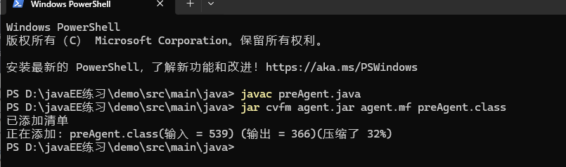 之后用命令行编译我们的preAgent.java文件,将mf清单与preAgent.class打包在一个jar包里