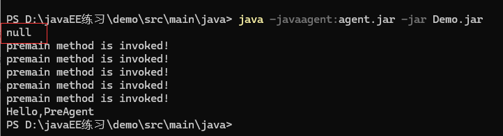 这个null就代表着premain方法的agentArgs参数,这里我们什么都没有传递,所以此处为null