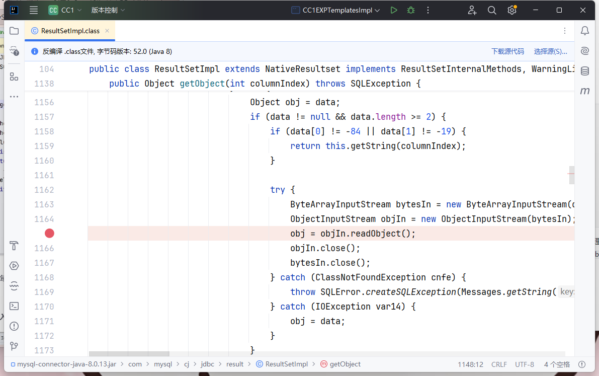 CC 链作为命令执行的部分,也就是说需要我们找一个 JDBC 合理的入口类,并且这个入口类需要在 JDBC 连接过程中被自动执行,最终是找到了这样一个类 com.mysql.cj.jdbc.result.ResultSetImpl,它的 getObject() 方法调用了 readObject() 方法