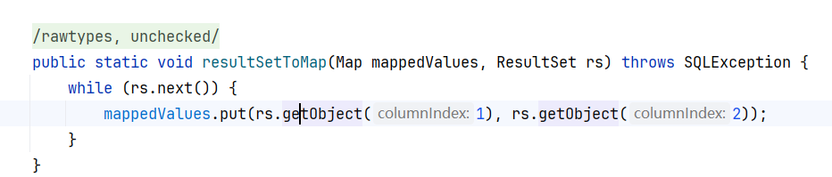 1 2 3 4 5 6 7 8 9 10 11 12 13 14 15 16 17 18 19 20 21 22 23 24 25 26 27 28 29 30 31 32 33 34 35 36 37 38 39 public Object getObject (int columnIndex) throws SQLException { try { this .checkRowPos(); this .checkColumnBounds(columnIndex); int columnIndexMinusOne = columnIndex - 1 ; if (this .thisRow.getNull(columnIndexMinusOne)) { return null ; } else { Field field = this .columnDefinition.getFields()[columnIndexMinusOne]; switch (field.getMysqlType()) { case BIT: if (!field.isBinary() && !field.isBlob()) { return field.isSingleBit() ? this .getBoolean(columnIndex) : this .getBytes(columnIndex); } else { byte [] data = this .getBytes(columnIndex); if (!(Boolean)this .connection.getPropertySet().getBooleanProperty(PropertyKey.autoDeserialize).getValue()) { return data; } else { Object obj = data; if (data != null && data.length >= 2 ) { if (data[0 ] != -84 || data[1 ] != -19 ) { return this .getString(columnIndex); } try { ByteArrayInputStream bytesIn = new ByteArrayInputStream (data); ObjectInputStream objIn = new ObjectInputStream (bytesIn); obj = objIn.readObject(); objIn.close(); bytesIn.close(); } catch (ClassNotFoundException var13) { throw SQLError.createSQLException(Messages.getString("ResultSet.Class_not_found___91" ) + var13.toString() + Messages.getString("ResultSet._while_reading_serialized_object_92" ), this .getExceptionInterceptor()); } catch (IOException var14) { obj = data; } }