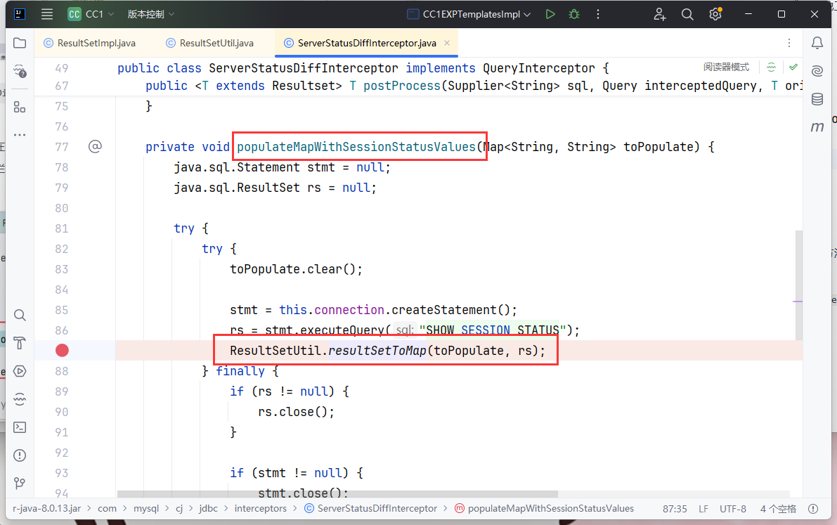往下跟,先运行查询语句 SHOW SESSION STATUS,接着调用了 ResultSetUtil.resultSetToMap()