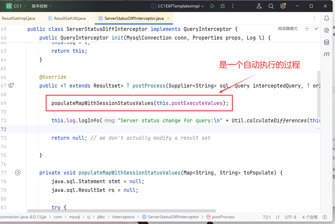 ServerStatusDiffInterceptor 是一个拦截器,在 JDBC URL 中设定属性 queryInterceptors 为 ServerStatusDiffInterceptor 时,执行查询语句会调用拦截器的 preProcess 和 postProcess 方法,这是一个自动执行的过程,我们可以把它作为利用链头