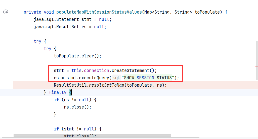 先建立了 JDBC 的连接,并创建查询,查询语句是 SHOW SESSION STATUS,接着调用 ResultSetUtil.resultSetToMap,完成查询并封装查询结果