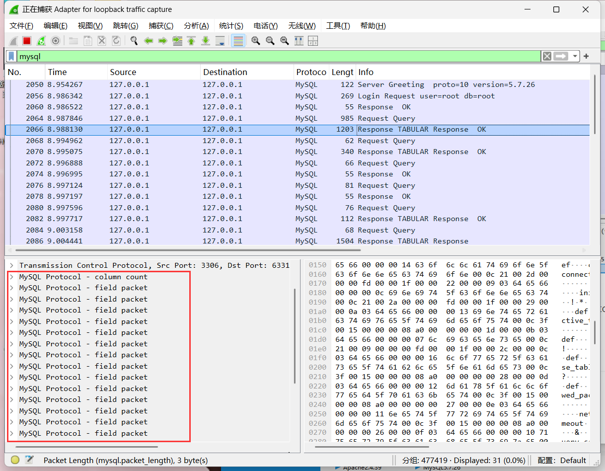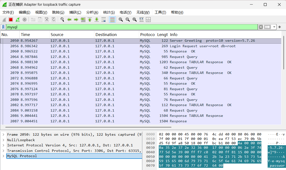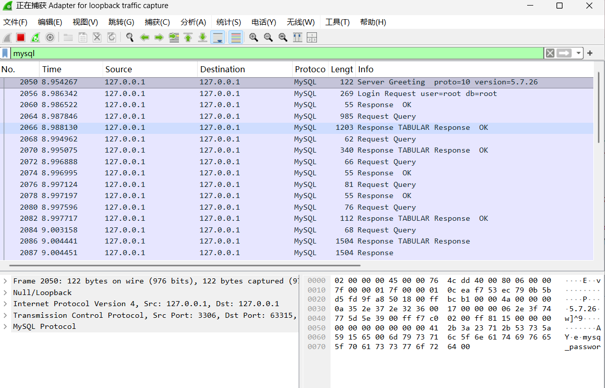 在本地开一个mysql服务,配置数据库信息后运行,使用wireshark进行抓包,并使用以下过滤语句过滤3306端口的mysql协议