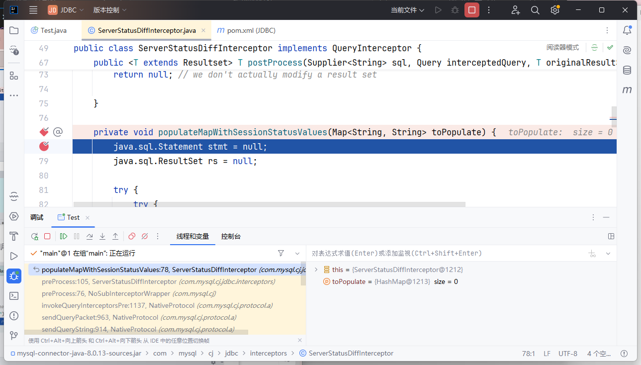 在 com.mysql.cj.jdbc.interceptors.ServerStatusDiffInterceptor#populateMapWithSessionStatusValues 下个断点,开始调试分析