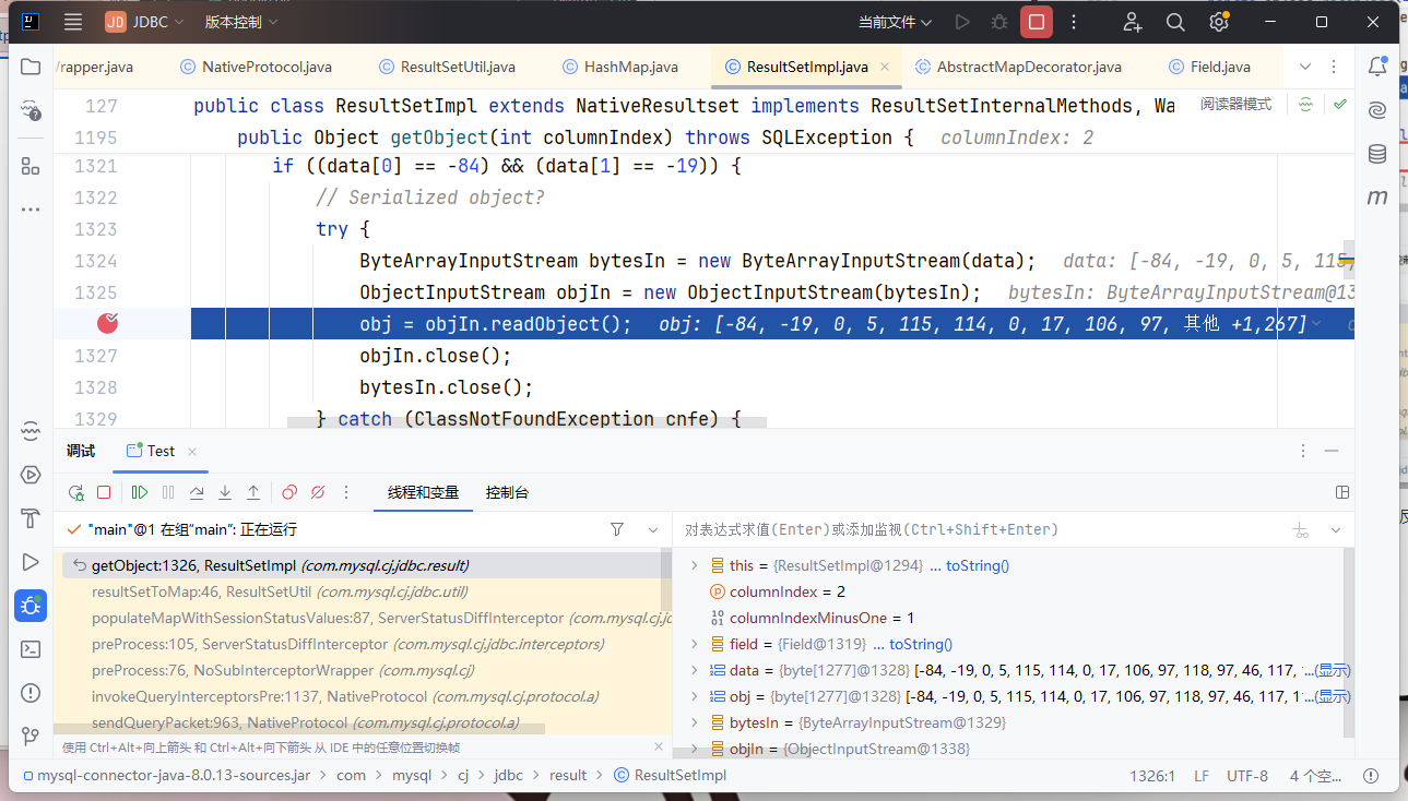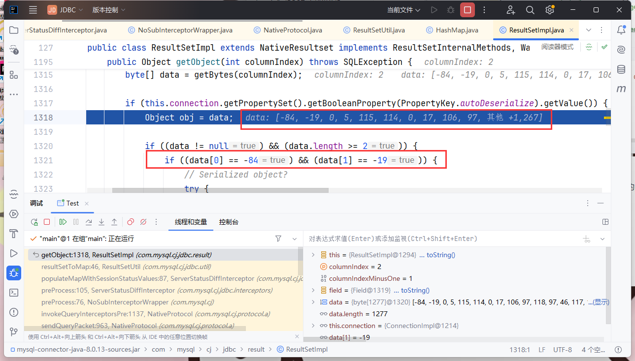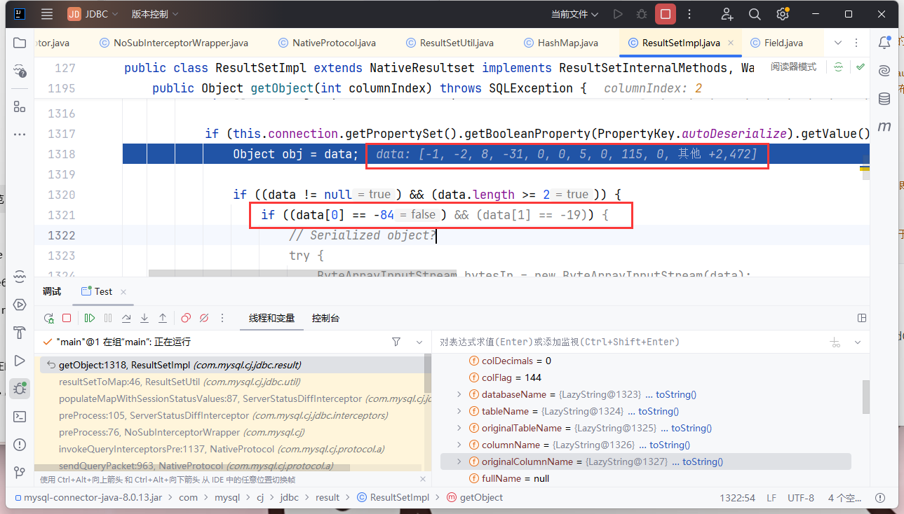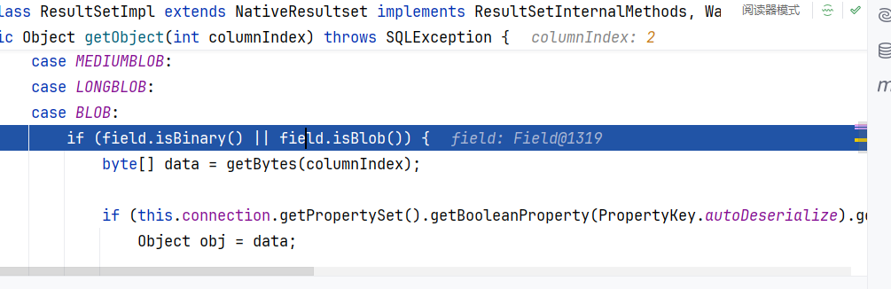 正常流程是ResultSetUtil.resultSetToMap() 调用了 getObject() 方法,第一处调用 getObject() 方法回返回 null,第二次调用时才会走到反序列化的代码逻辑里面