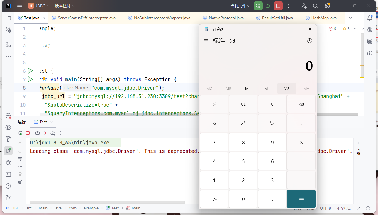 1 2 3 4 5 6 7 8 9 10 11 12 13 package com.example;import java.sql.*;public class Test { public static void main (String[] args) throws Exception { Class.forName("com.mysql.jdbc.Driver" ); String jdbc_url = "jdbc:mysql://127.0.0.1:3306/root?characterEncoding=UTF-8&serverTimezone=Asia/Shanghai" + "&autoDeserialize=true" + "&queryInterceptors=com.mysql.cj.jdbc.interceptors.ServerStatusDiffInterceptor" ; Connection con = DriverManager.getConnection(jdbc_url, "root" , "123456" ); } }