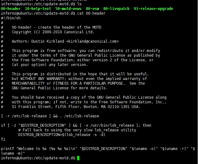 进入update-motd.d目录,查看00-header 文件(一般是执行欢迎动作的脚本)