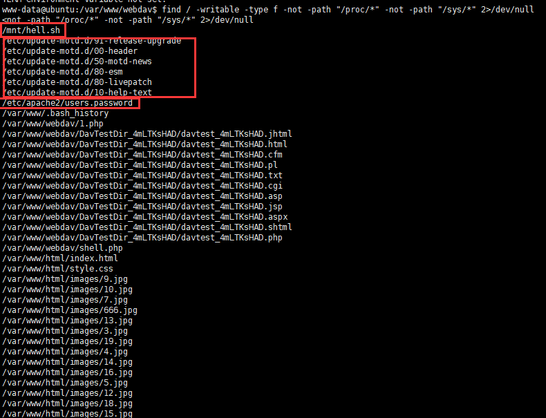 查找有写入权限的文件->关注.sh,passwd,有可执行脚本的文件