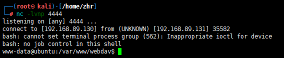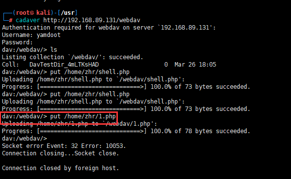 使用cadaver上传一个可执行php木马->成功获取到web用户shell